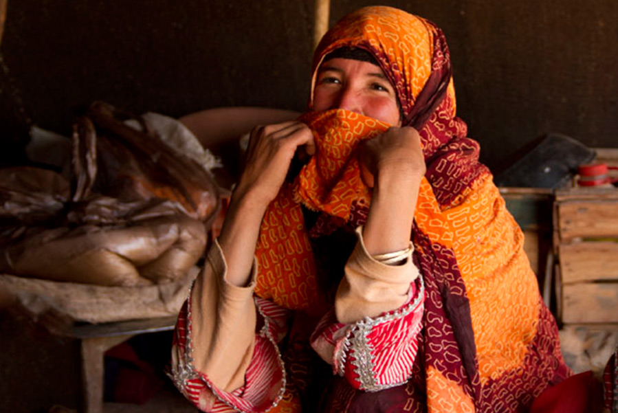 When visitors arrive the women generally remain in the background and often require the husband's consent to have their photos taken. They are careful to veil themselves with the traditional hijab headscarf in the presence of visitors and certainly before strangers. The men are responsible for herding the sheep, goats and camels and the buying and selling of animals. The women and girls raise any orphan new-born. When a family travels to a new desert location the men head out across the desert driving the herd before them. Some will ride camels laden with household goods. The women, often riding donkeys, follow with the children and younger animals.